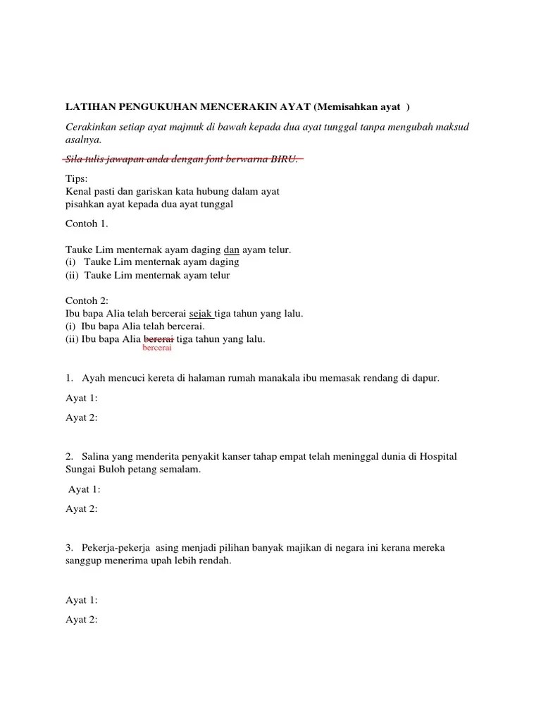 Pasukan manchester united akan berhenti menjalani latihan bola sepak ________hujan . 1 subjek 1 predikat saya sakit rumah ali . Cerakinkan setiap ayat majmuk di bawah ini supaya menjadi dua ayat tunggal. Latihan ayat tunggal dan ayat majmuk. Pilih kata hubung yang sesuai bagi menggabungkan dua ayat tunggal di bawah. (sila print nota & latihan dan masukkan dalam fail bahan pembelajaran bahasa melayu). Adik keletihan lalu tertidur di . Anda digalakkan menjawab kesemua soalan .